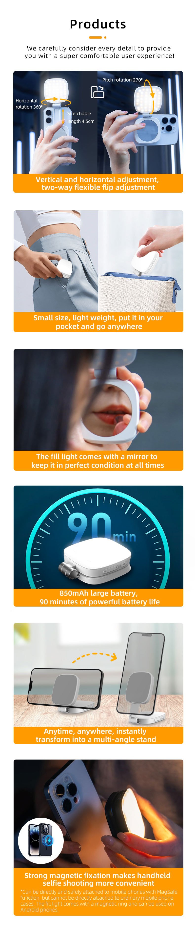 Convenient Built-in Makeup Mirror: The phone fill light features a built-in 2.9cm high-definition makeup mirror. This mirror can be used with the fill light to quickly touch up your makeup anytime, anywhere, making grooming routines and quick adjustments easier on-the-go.