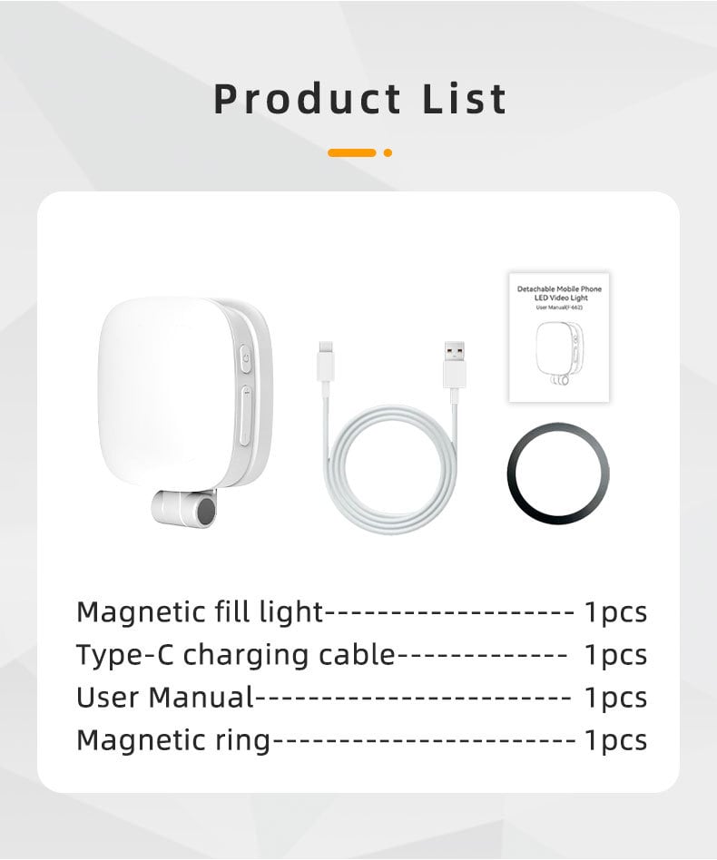 The phone selfie light has 5 levels of light sources, adjustable between 3000K and 6500K,along with 20-100% stepless brightness adjustment.. The light is easily controlled by pressing the button. This elevates the appearance of skin and eyes in your photos and videos, creating captivating lighting effects for visually striking content.