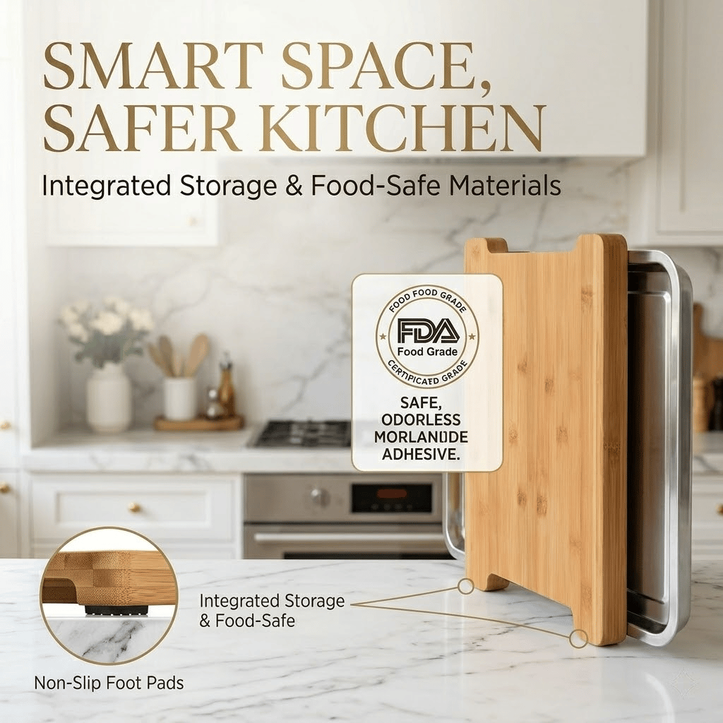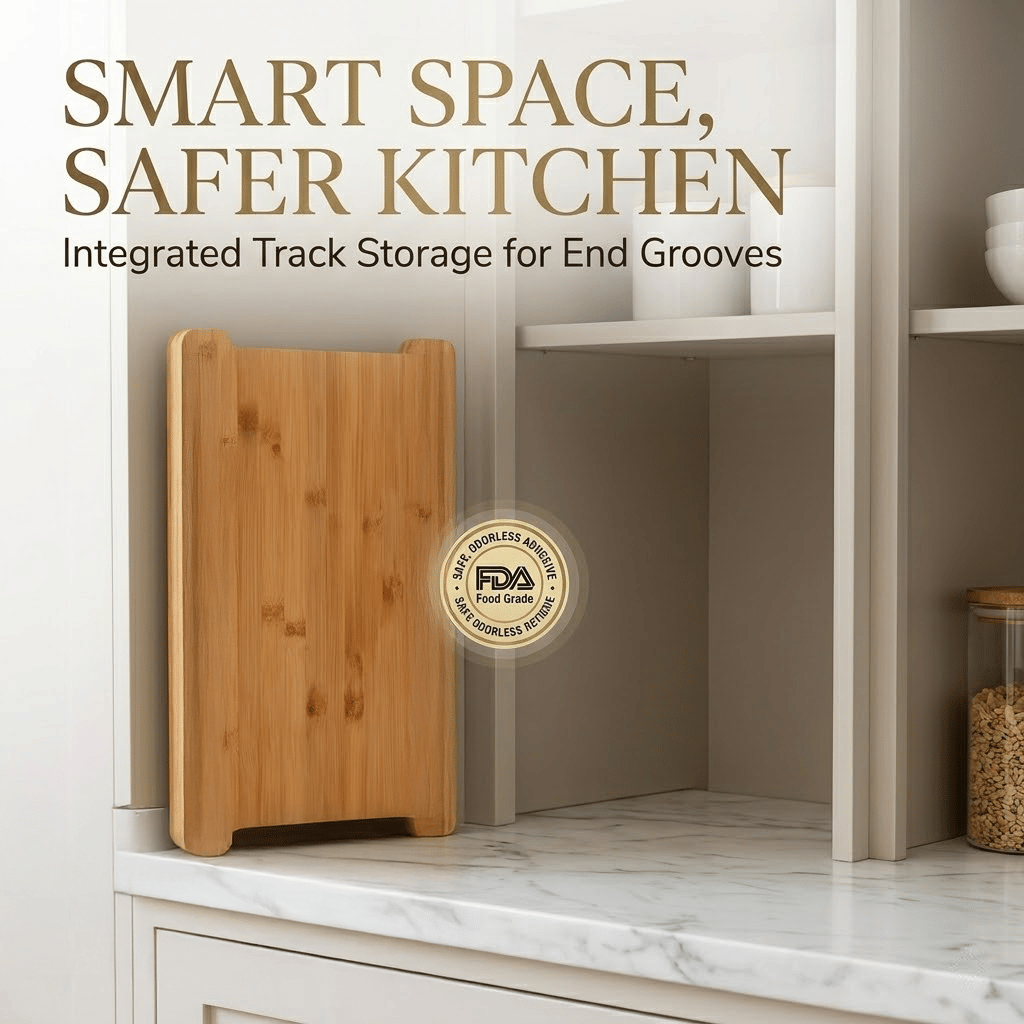 📐 Compact Vertical Elegance: Space is a premium, even in the grandest kitchens. Our intelligent design features integrated pads that allow the board to Stand Vertically in narrow spaces, ensuring that your culinary station is always accessible but never in the way.