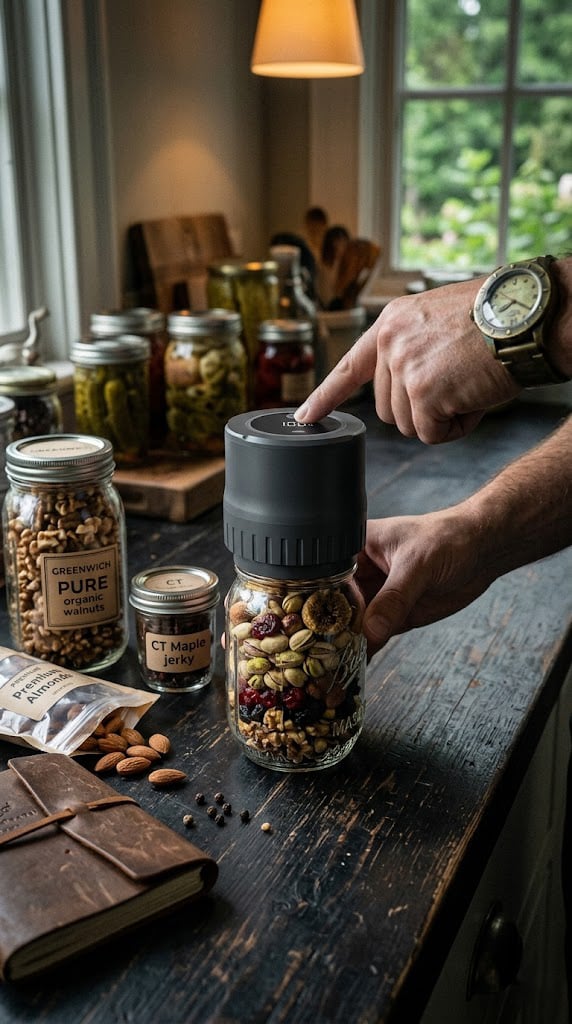 "I was tired of my expensive organic nuts and dried fruits going stale. The Artisan Preserver is a game-changer. One click and it’s done. The battery lasts forever, and I love that it works for both my large and small jars. Worth every penny."