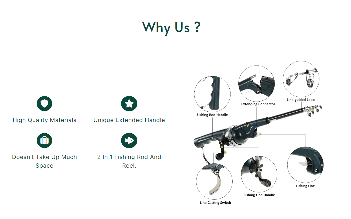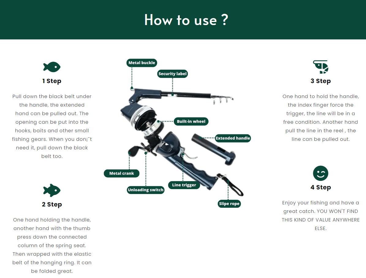 Starts with our amazing folding fishing rod! This compact wonder tool is perfect for professionals and novice anglers alike. Light in weight, it is perfect for long hikes and ready to be your trusted companion in the world of fishing